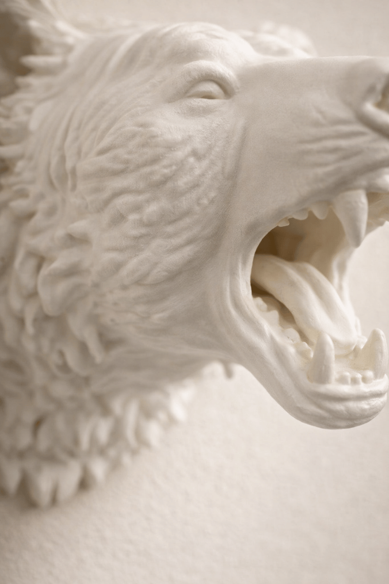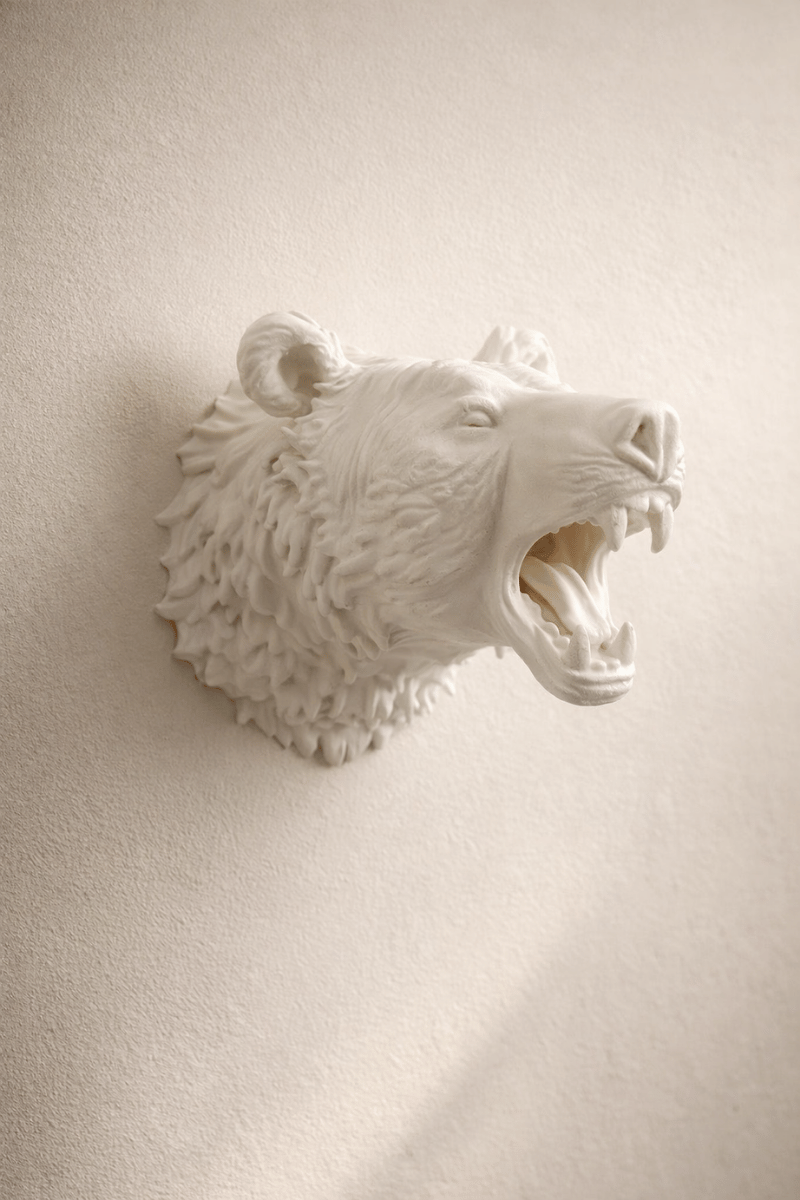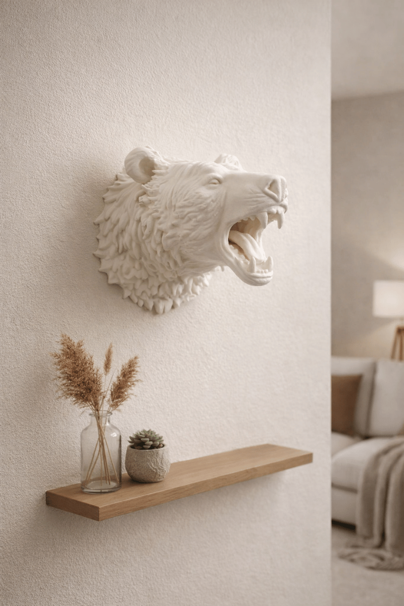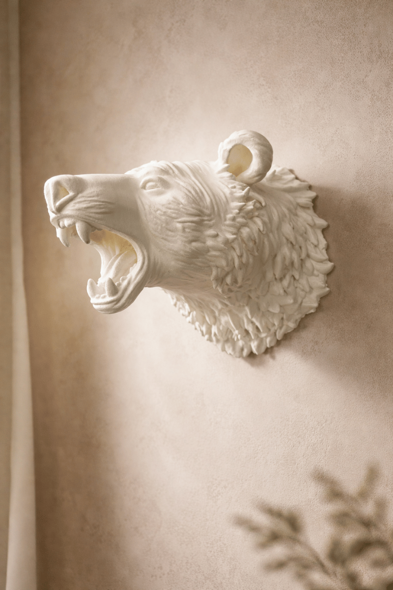 Doğadan ilham alan bu ayı figürlü duvar heykeli, heykelsi detayları ve mat beyaz yüzeyiyle bulunduğu mekâna karakter katar. Açık ağız formu ve detaylı doku çalışması, güçlü bir ifade yaratırken; sade renk paleti sayesinde modern, minimal ve dengeli alanlara uyum sağlar.