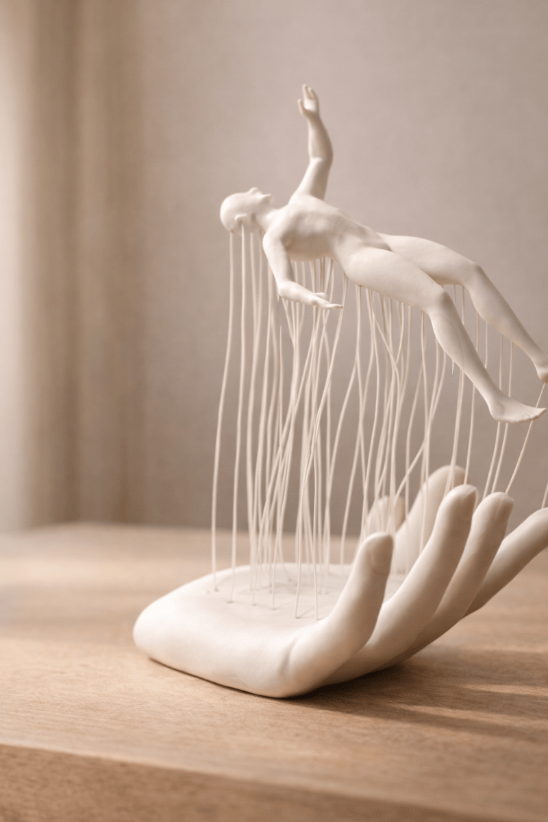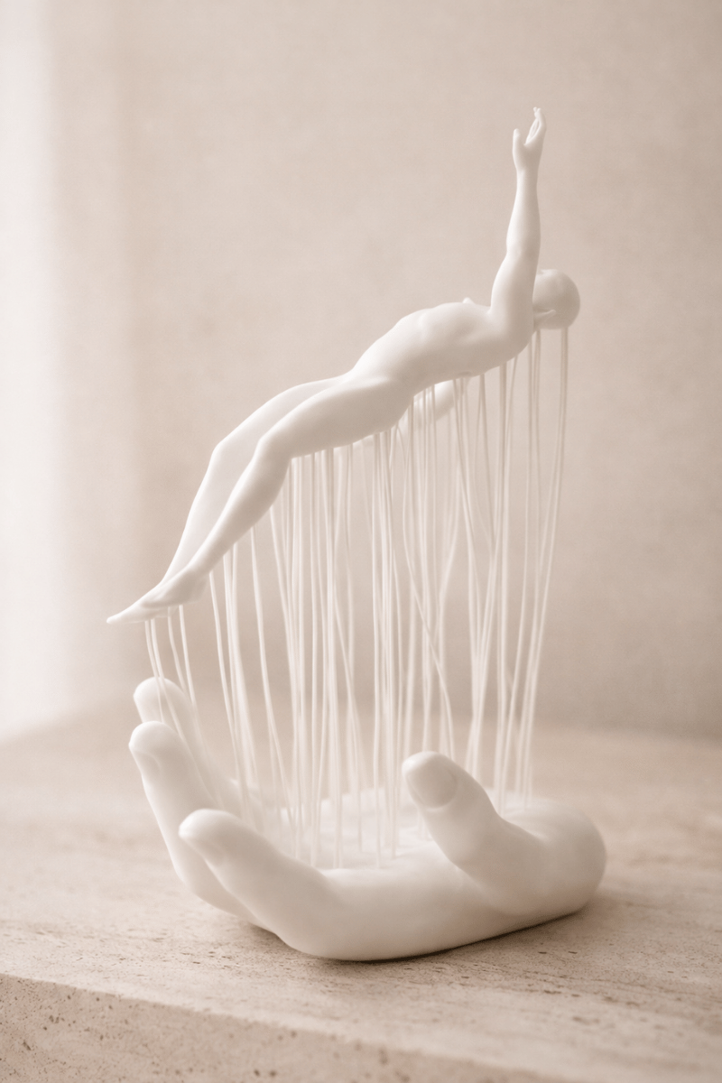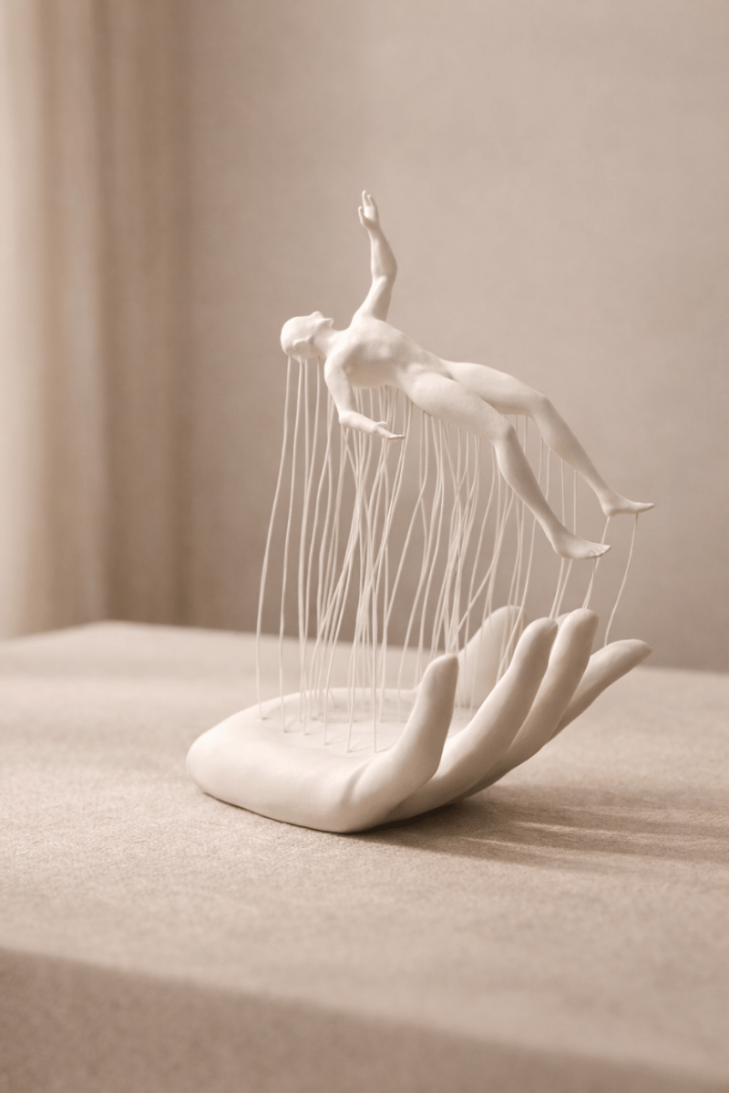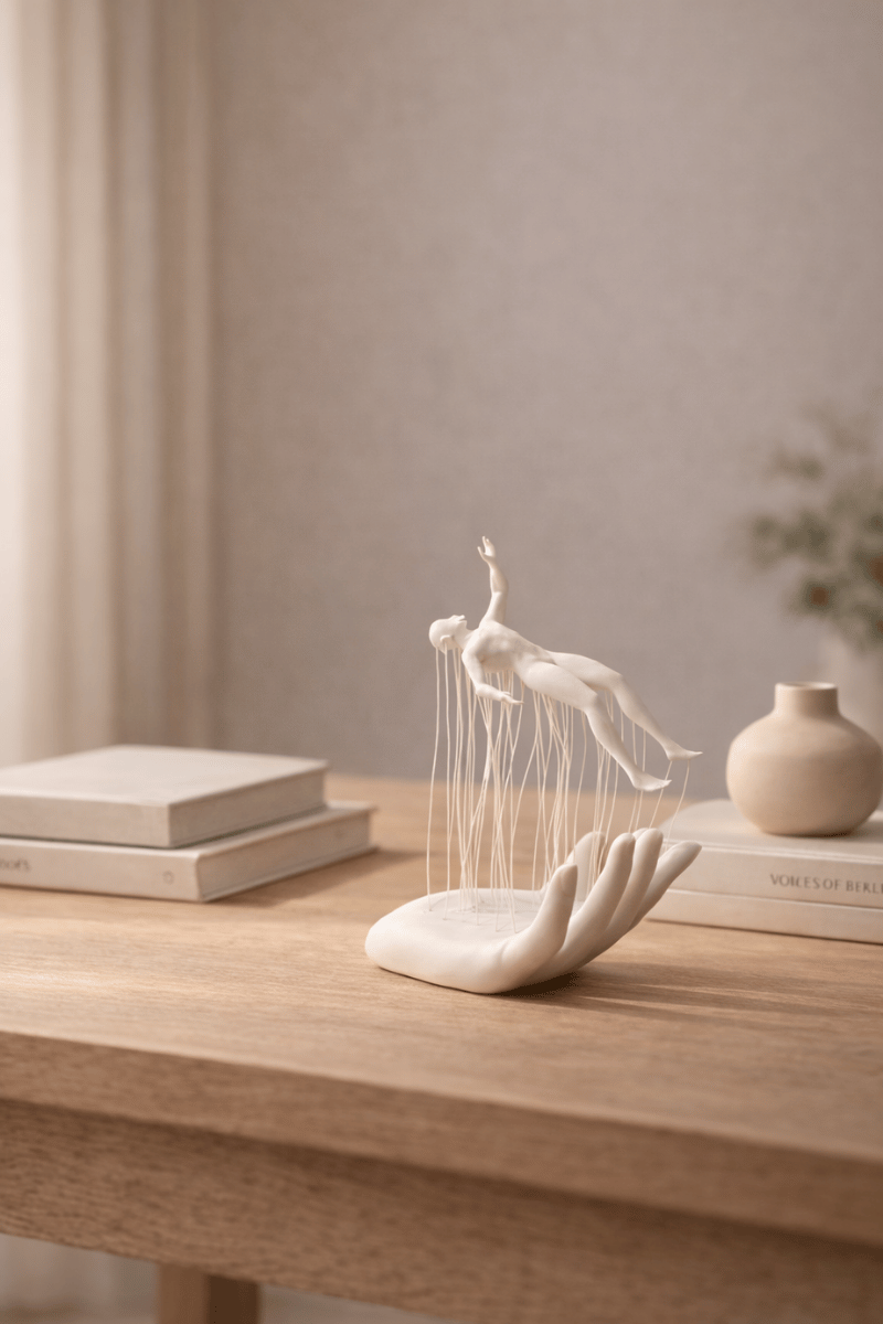 El Üstünde Beden, insan formunu taşıyan bir el üzerinden denge, güven ve teslimiyet kavramlarını yorumlayan heykelsi bir dekor parçasıdır.