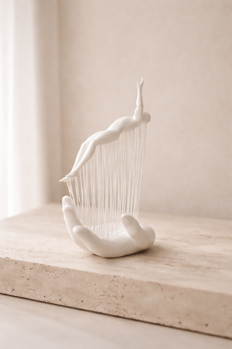 Askıda kalmış gibi duran beden formu, bulunduğu mekânda zamansız bir an hissi yaratır. Mat beyaz yüzeyi ve sade oranları sayesinde çevresindeki alanla yarışmaz; aksine, boşluğu anlamlı bir şekilde tamamlar.