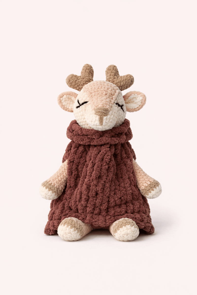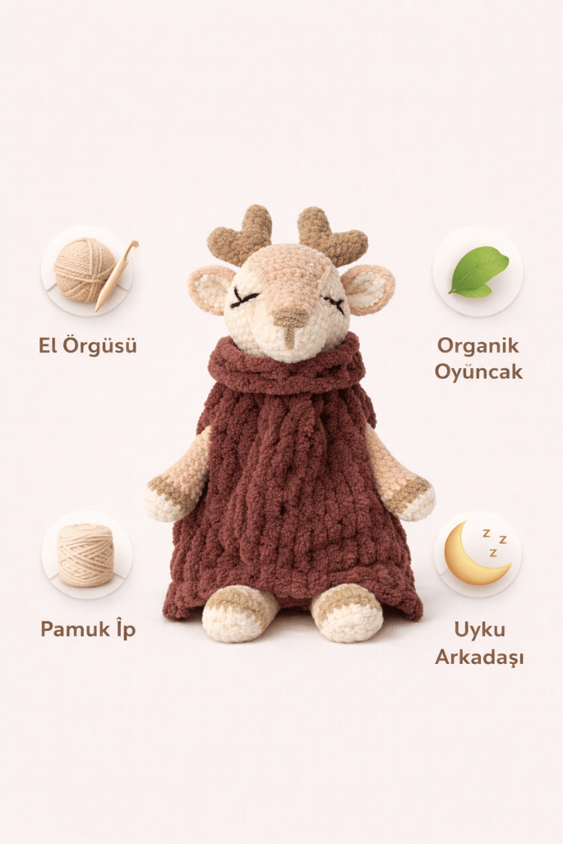 Geyik amigurumi uyku arkadaşı, el emeği ile hazırlanan ve bebekler için güvenli kullanım sunan yumuşak dokulu özel bir oyuncaktır. Amigurumi tekniği ile üretilen bu oyuncak, doğal pamuk ip kullanılarak hazırlanmış olup hassas ciltlerle uyumludur.