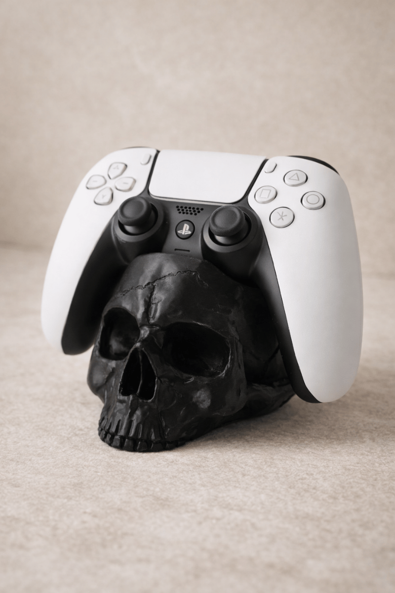 Sessiz bir tasarım diliyle şekillenen kurukafa şekilli gamepad tutucu, oyun alanlarını yalnızca düzenlemekle kalmaz; bulunduğu mekâna güçlü ve modern bir karakter kazandırır.