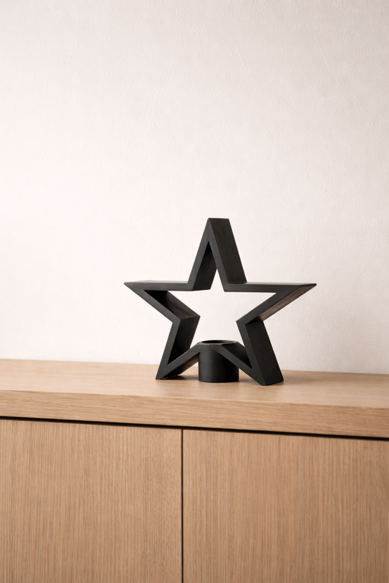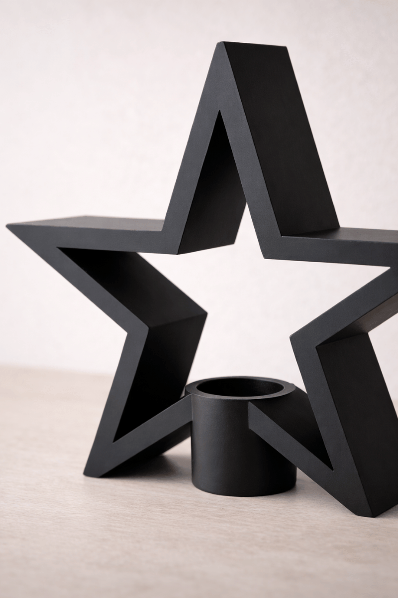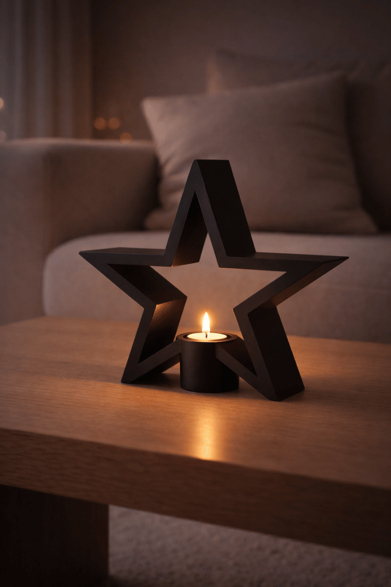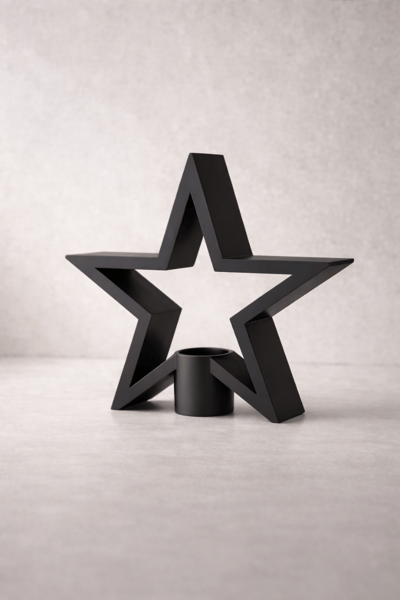 Keskin hatları ve güçlü geometrisiyle öne çıkan bu yıldız formlu mumluk, yaşam alanlarında sessiz ama etkili bir duruş sergiler.
